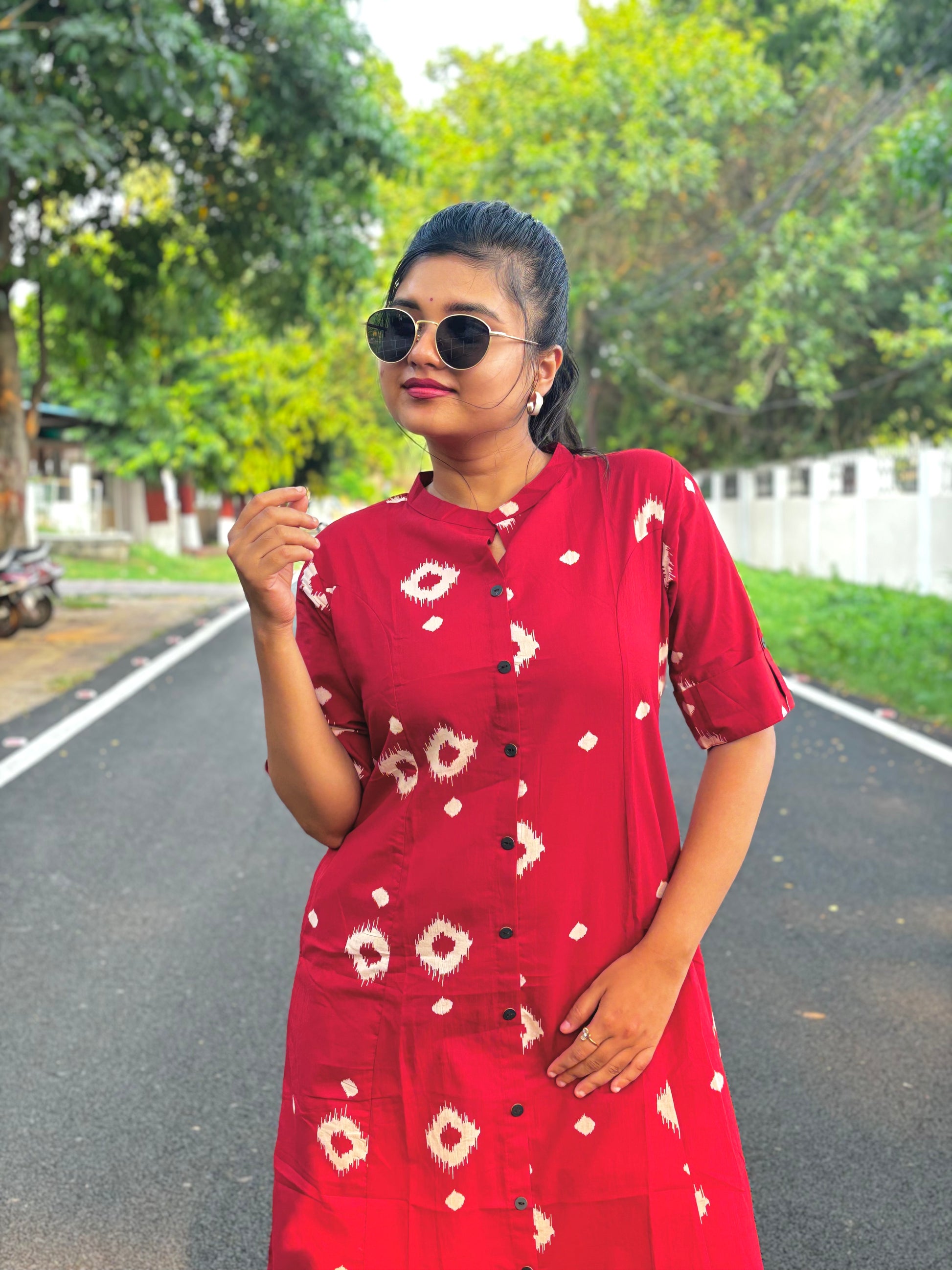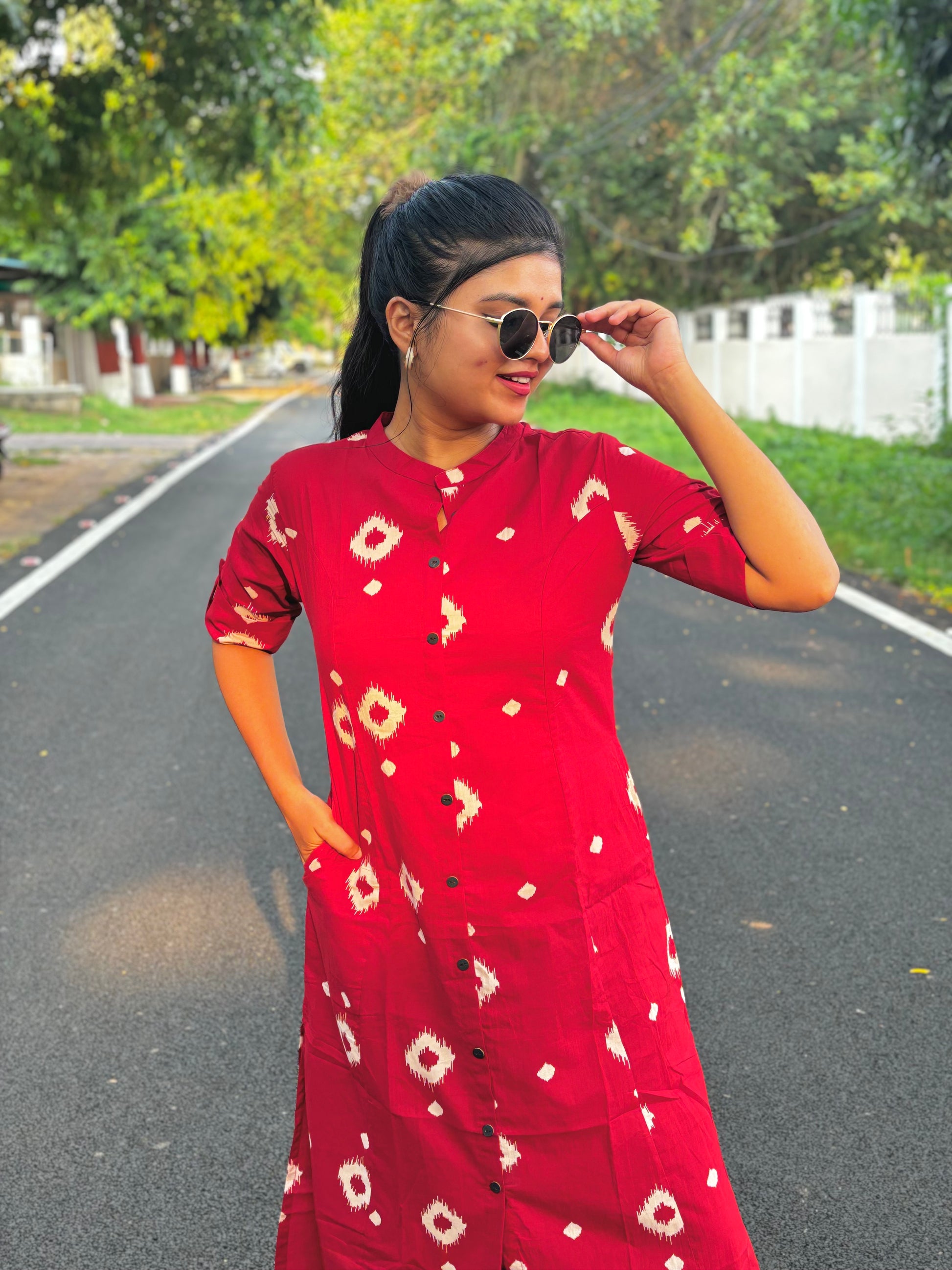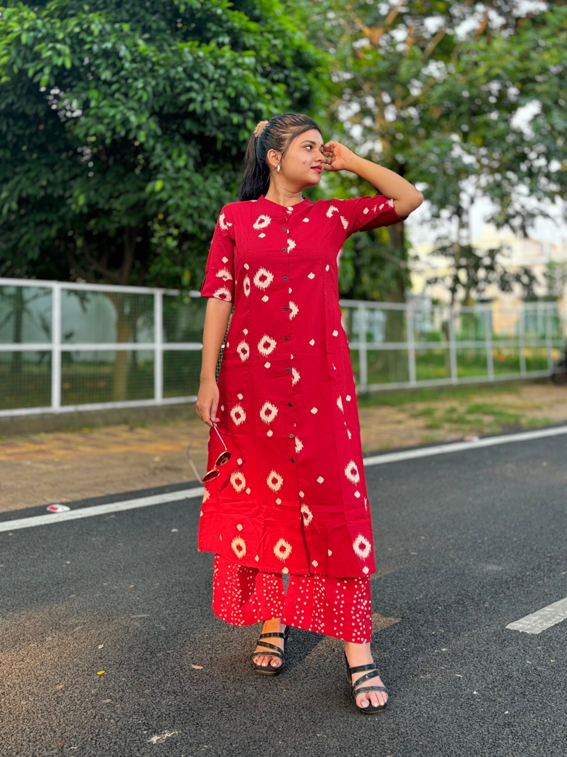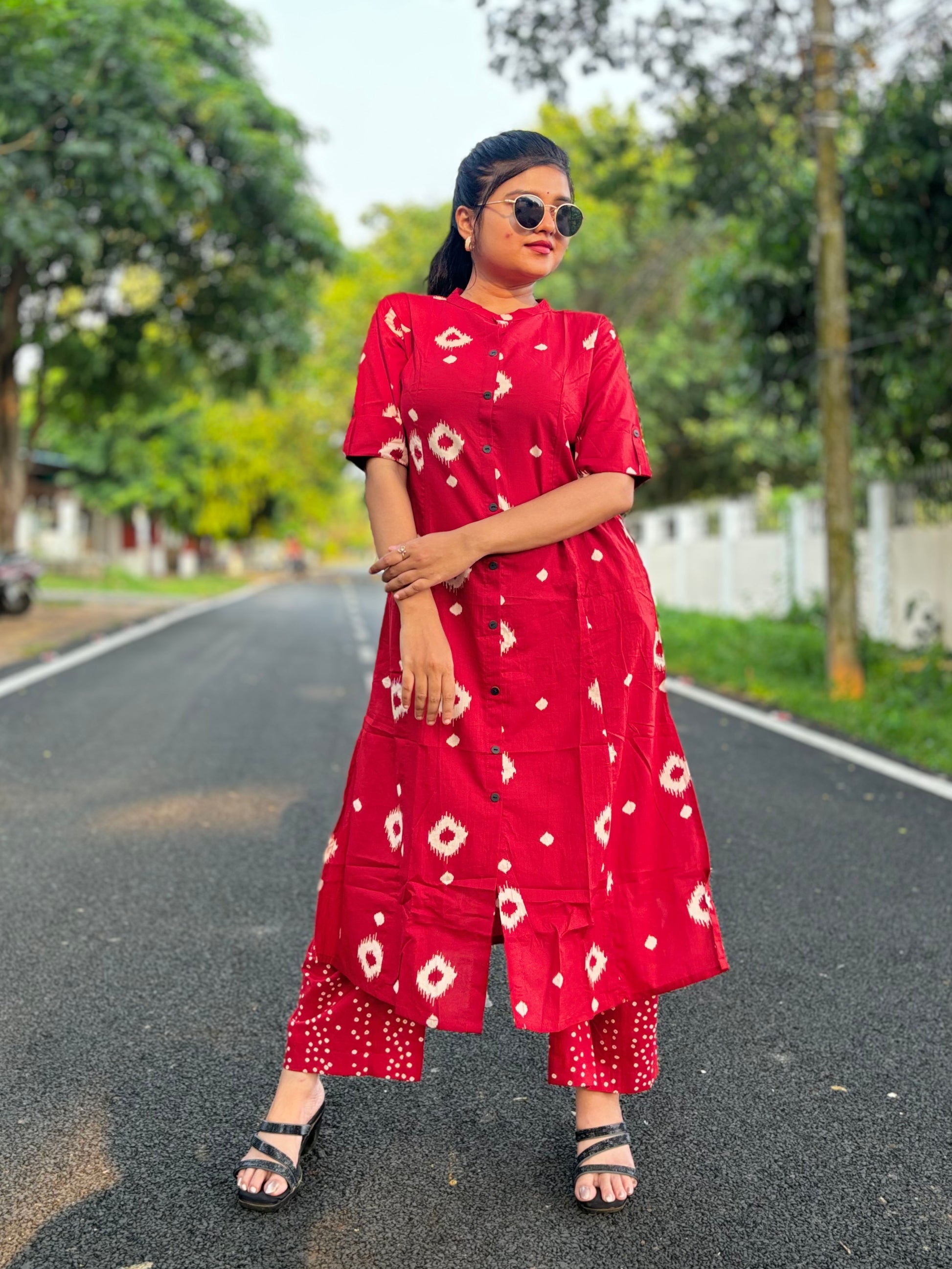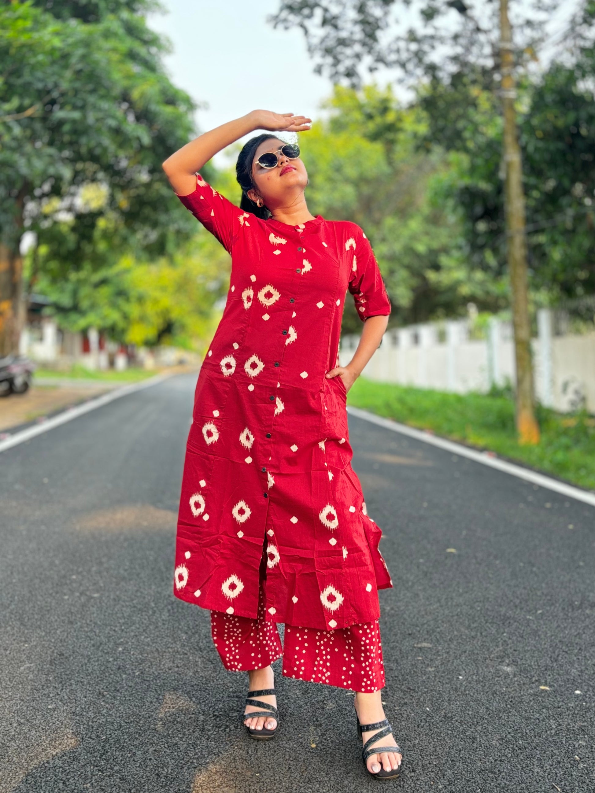 Turn heads with this vibrant red cord set detailed with dainty hand-block floral prints – perfect for making bold yet elegant statements.