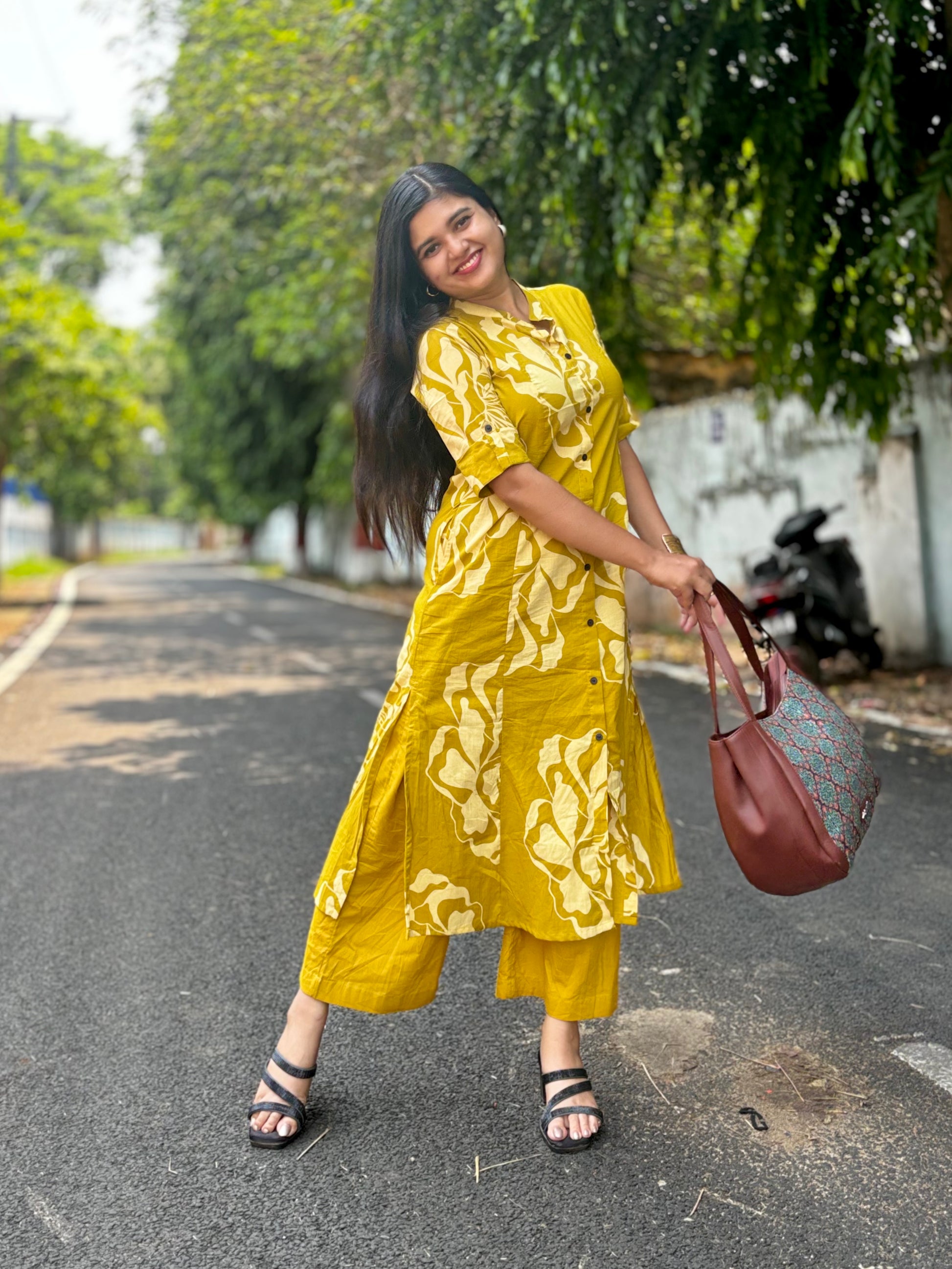 ✔ Bold floral prints in light yellow on a mustard base